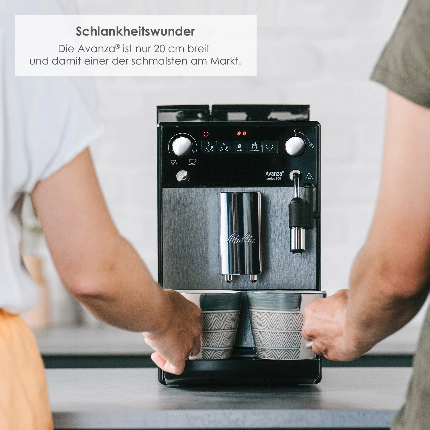 Die Melitta® Avanza® steht für puren Kaffeegenuss und platzsparendes, zeitloses Design. Die gewünschte Kaffeespezialität und Kaffeestärke lassen sich einfach über die Direktbezugstasten auswählen. Für XL-Kaffeevergnügen sorgen der extragroße Wassertank, der 250-g-Bohnenbehälter und die „Double Cup“-Funktion, mit der sich zwei Tassen Kaffee gleichzeitig zubereiten lassen. Mit unserem Easy Cappuccinatore lassen sich auch Kaffee-Milch-Getränke in nur zwei Schritten zubereiten: Milch aufschäumen, Kaffee beziehen, genießen.