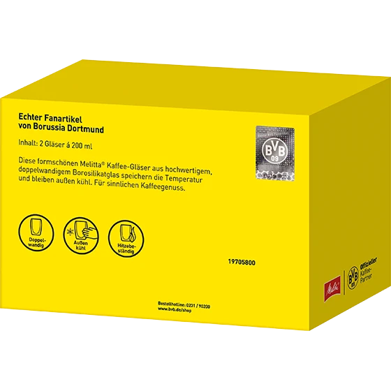 Die Kaffee-Gläser beeindrucken nicht nur durch ihr besonderes BVB-Design, sondern auch durch ihren doppelwandigen Aufbau. Denn dieser sorgt sowohl für den idealen Temperaturerhalt deines Kaffees als auch dafür, dass du das Glas problemlos halten kannst. So lässt sich das Spiel genießen!