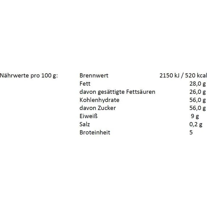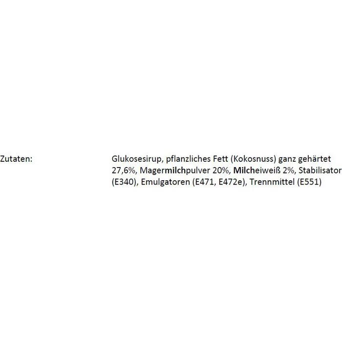 Glukosesirup, pflanzliches Fett (Kokosnuss) ganz gehärtet 27,6%, MAGERMILCHPULVER 20%, MILCHEIWEIß 2%, Stabilisator (E340), Emulgatoren (E471, E472e), Trennmittel (E551)