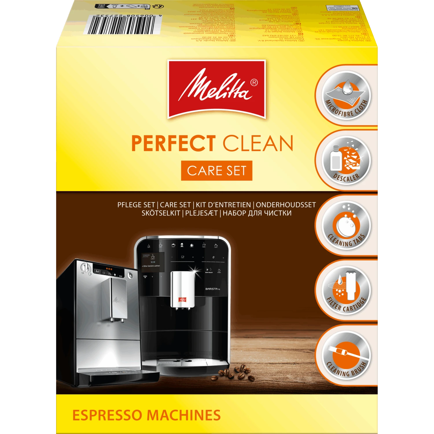 Das Perfect Clean Care Set enthält alle Produkte, die du für die Pflege deines Kaffeevollautomaten benötigst: der Anti Calc Flüssigentkalker, die Perfect Clean Reinigungstabs, ein Mikrofasertuch, die PRO AQUA Filterpatrone und ein Reinigungspinsel.